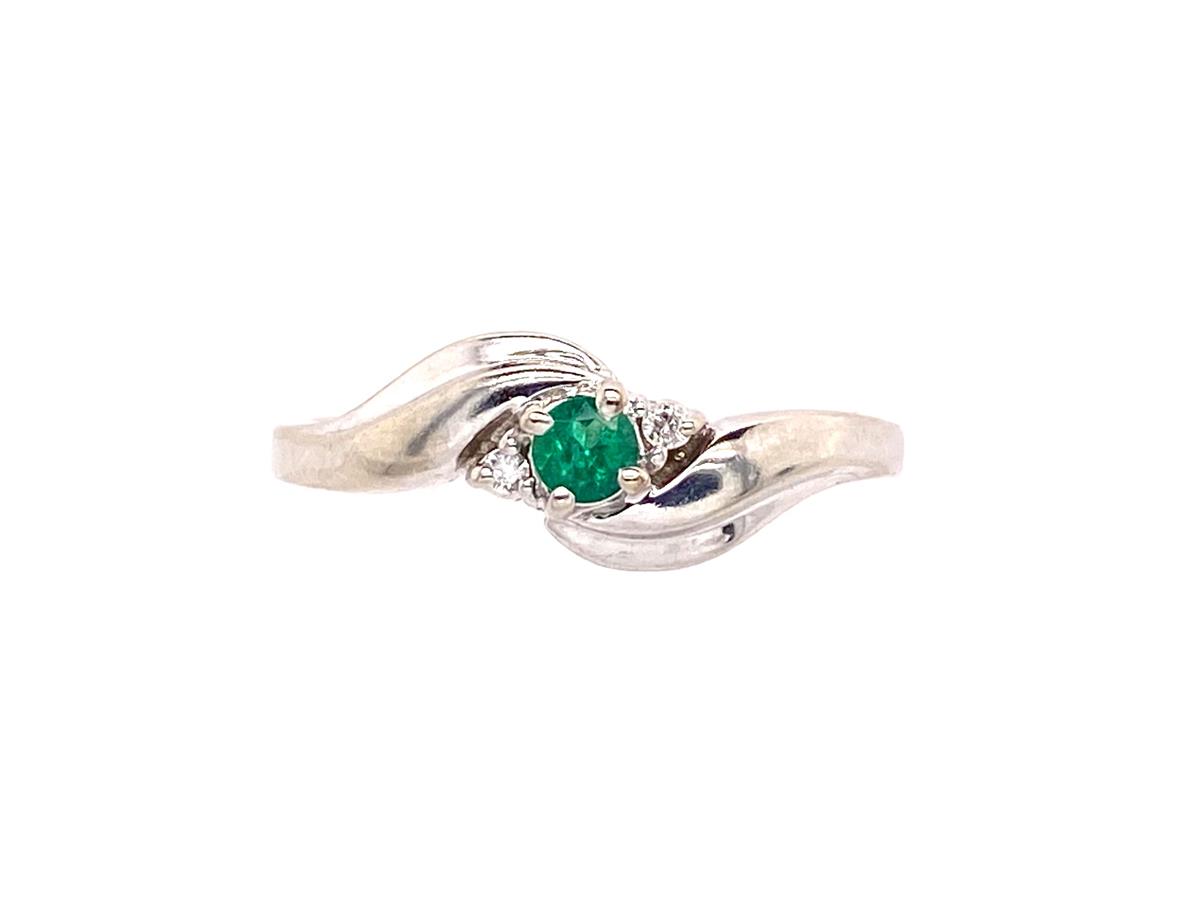 A very pretty and unusual design from USA - stamped 10k, this features a lovely colour Emerald flanked by two brilliant cut Diamonds in an elegant crossover design. AS NEW CONDITION.