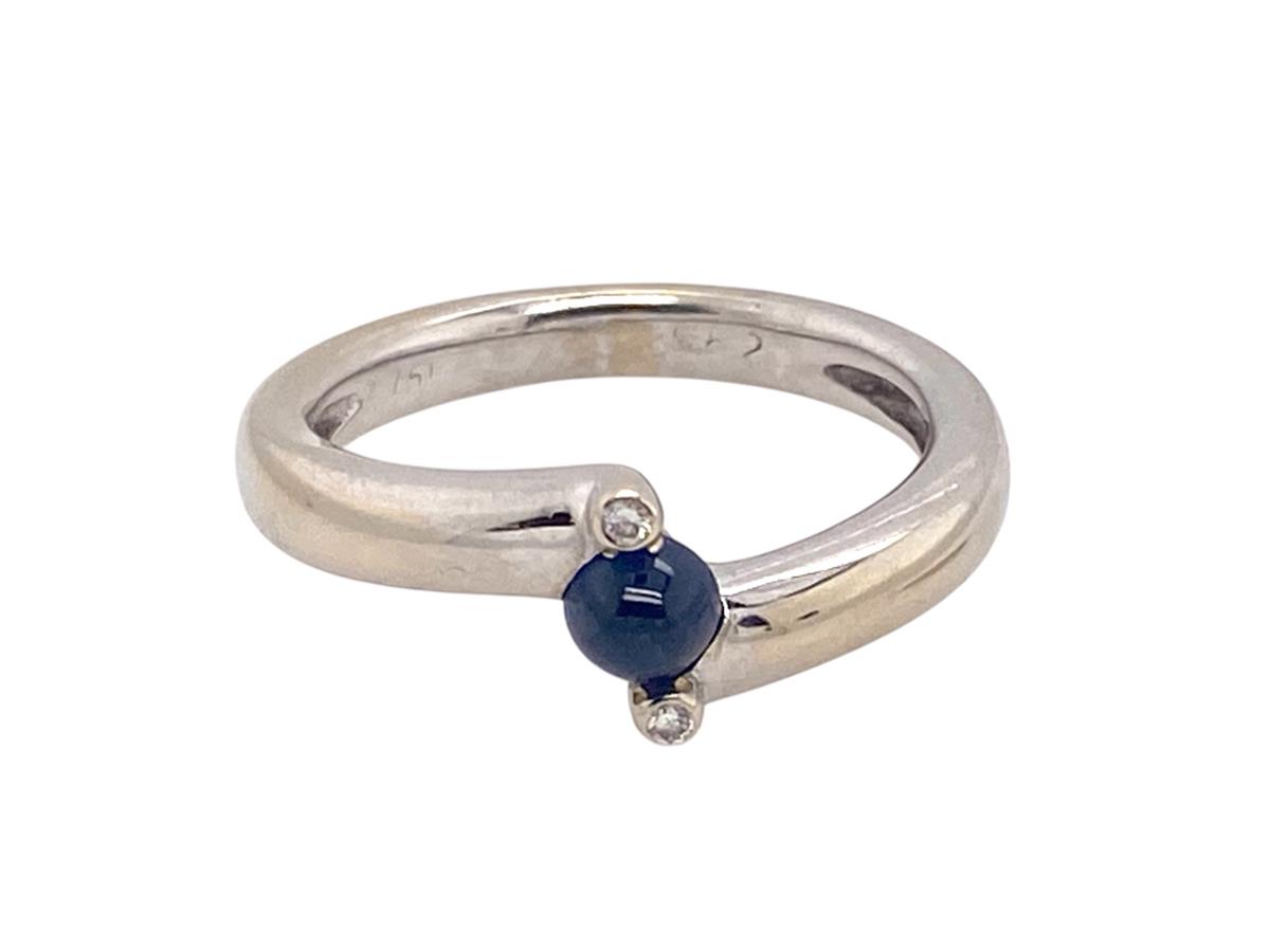 A very rare design - stamped '750' and assessed as 18ct. White Gold thiss pretty piece comprises a genuine cabochon cut Sapphire with a brilliant cut Diamond each side, all cleverly set in a twist effect. Substantial weight and as new condition. This will turn heads!!