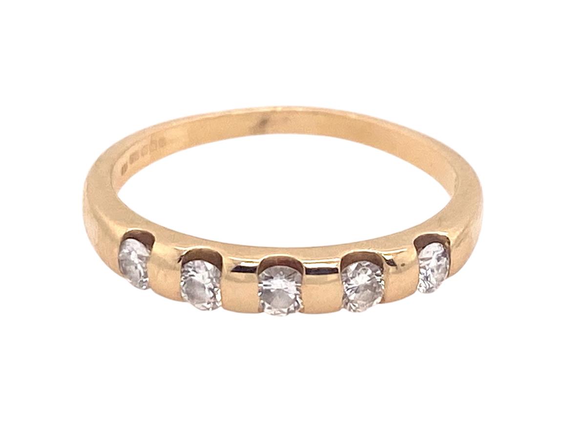 A lovely 18ct. Hallmarked half eternity ring with 5 brilliant cut Diamonds in channel settings, total diamond weight assessed as 0.33cts. This high quality ring would make an ideal gift.