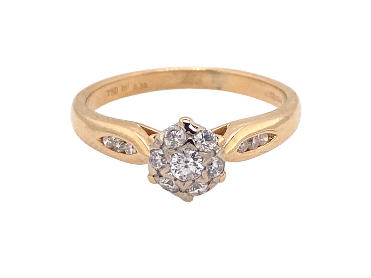 A lovely vintage 18ct. Hallmarked cluster ring claw set with 7 brilliant cut Diamonds on the head, and 3 diamonds channel set on each shoulder. With a total Diamond weight of 0.33cts, this is EXCELLENT VALUE!