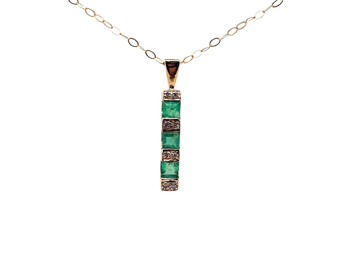 A lovely 9ct. gold 'stick' pendant set with 3 good colour square cut Emeralds, channel set, and 8 brilliant cut claw set Diamonds, Suspended from a 9ct. gold trace link chain. THE IDEAL GIFT!