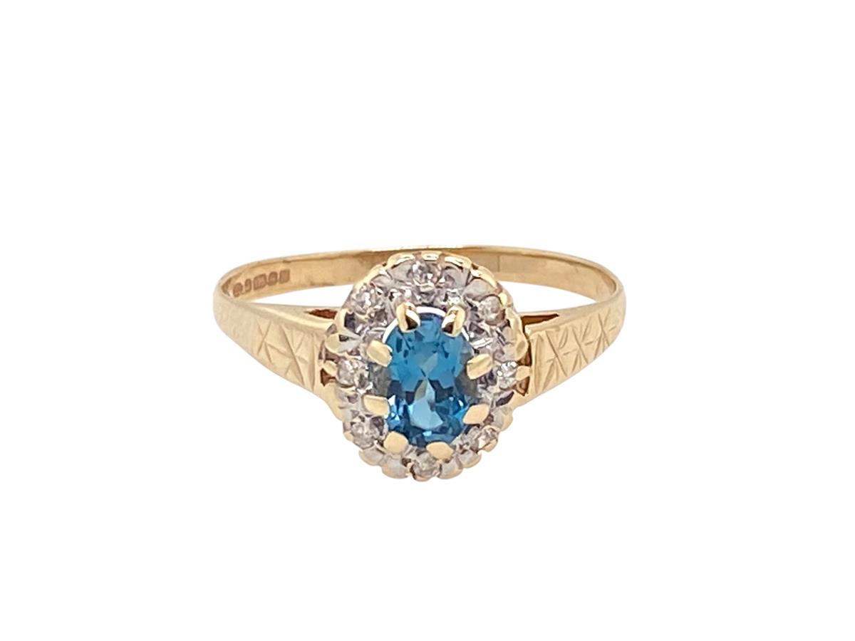A vintage 1970's 9ct. Hallmarked cluster with a rich colour London Blue Topaz and Diamonds in claw set surround. The diamond cut shoulders are typical of this very popular era.