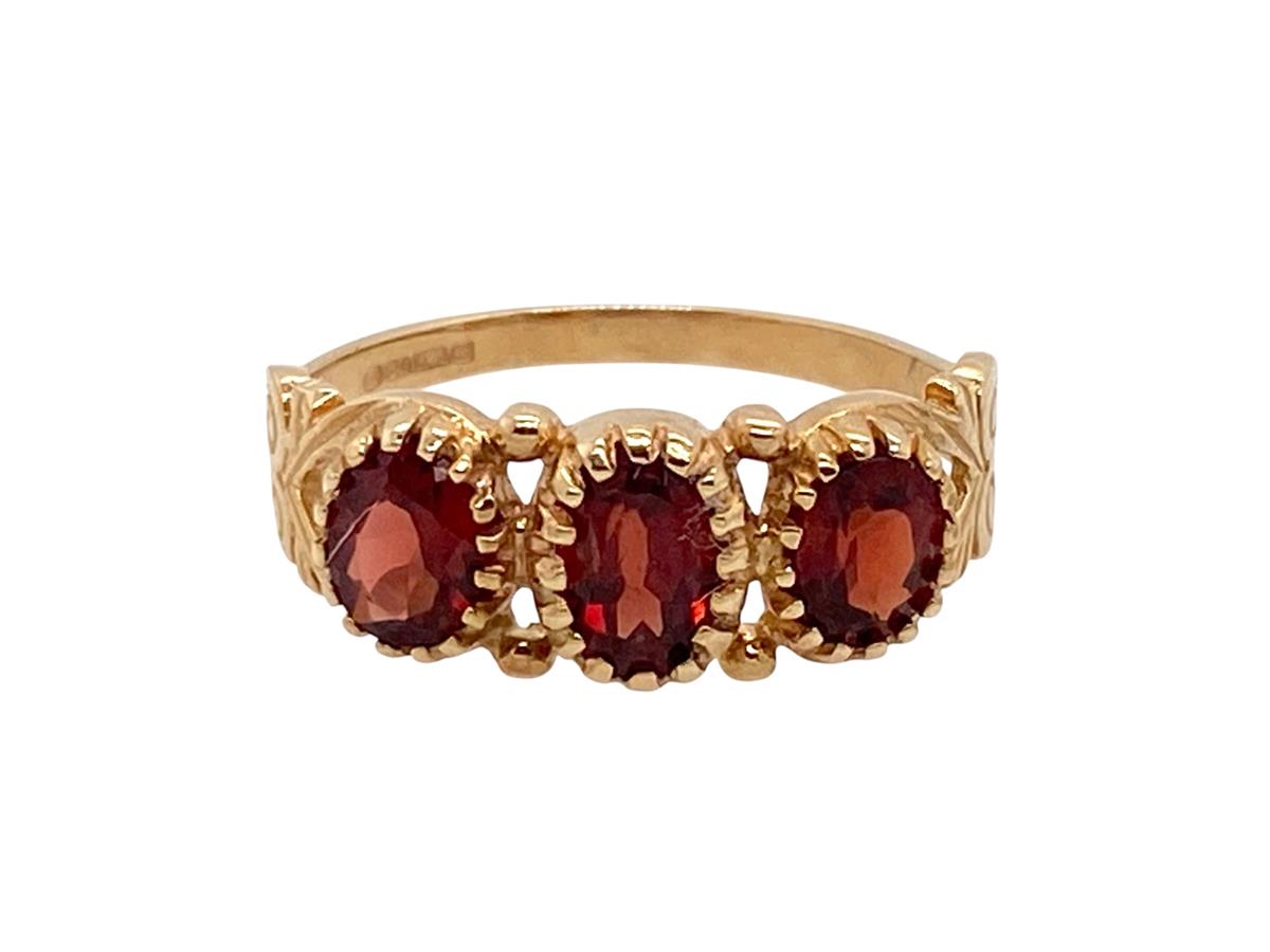 A very pretty vintage 9ct. Hallmarked filigree design band featuring 3 genuine Pyrope Garnets in intricate multi claw settings and with split engraved shoulders. In an as new condition !