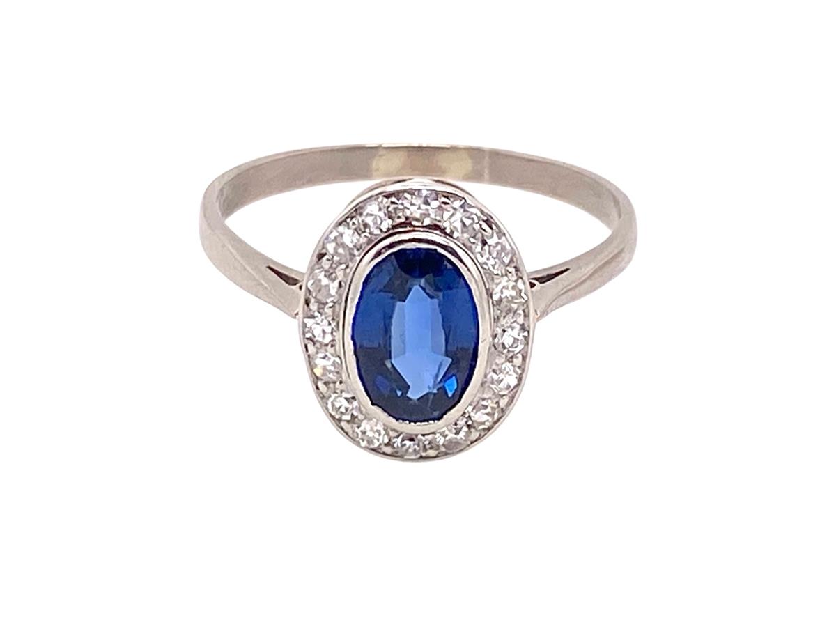 TIP TOP QUALITY! This vintage cluster has been refurbished to a high standard in our workshop. Assessed as 18ct. White Gold, it features a rich blue Sapphire, approx 0.80cts, whicth a surround of 16 old Brilliant cut Diamonds total assessed as 0.30.cts, all rubover/grain set to sit low on the finger - VERY DESIRABLE !!