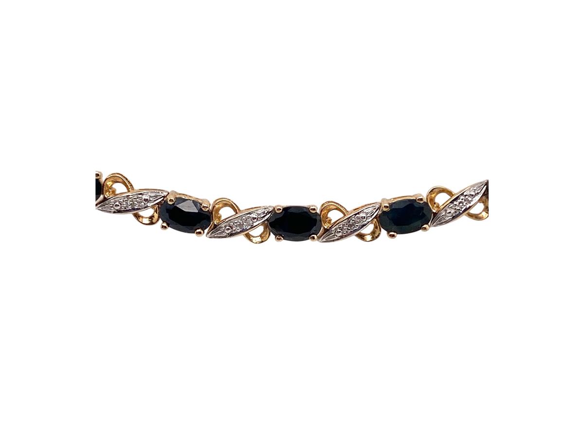 A magnificent 9ct. Hallmarked bracelet with 14 matched Sapphires each in 4 claw settings, 14 Diamonds in yellow & white gold x pattern links and with an invisible tongue fastening and safety clip, this beautiful piece makes an ideal gift.