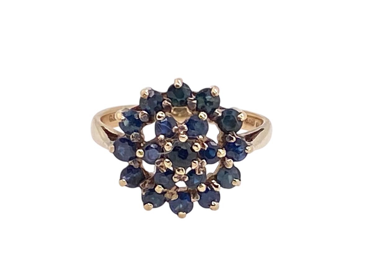 A beautiful vintage 9ct. Hallmarked cluster ring individually claw set with 19 lovely colour Sapphires in 3 tiers. This lovely piece is ideal for all Sapphire lovers and is n an as new condition.