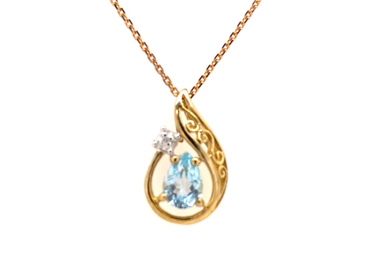 A gorgeous filigree design 9ct. Hallmarked pendant set with a pear shaped 0.75cts. Sky Blue Topaz and a Brilliant Cut Diamond all in neat claw settings and suspended from a 9ct. Diamond cut belcher link chain - EXCELLENT VALUE!!