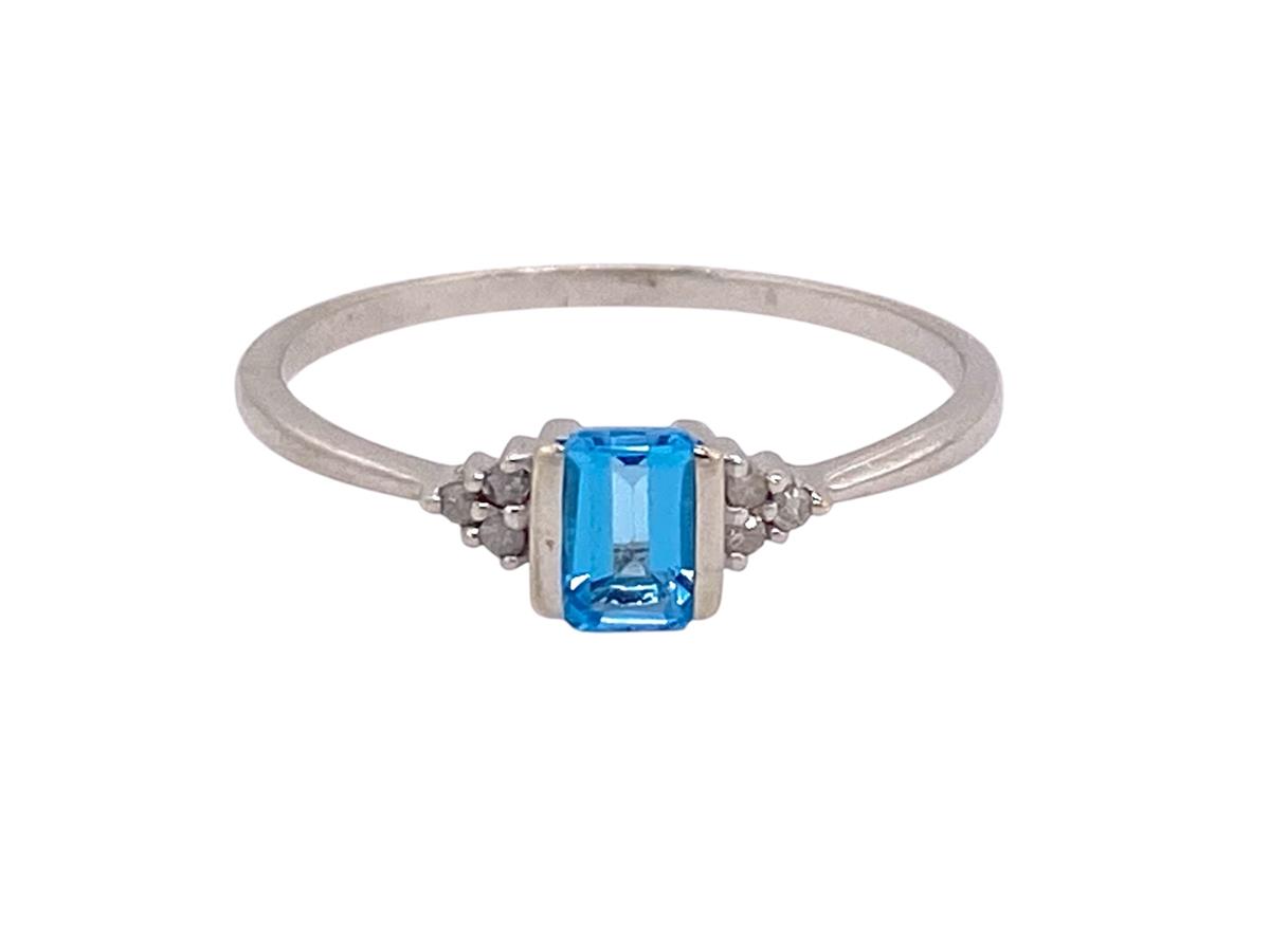 A lovely Vintage 9ct. Hallmarked white gold ring featuring a rich colour 0.65 cts. Swiss Blue Topaz with a 'trefoil' of Diamonds each side. Blue Topaz are always popular and this setting shows off this vibrant colour stone to its best advantage !!