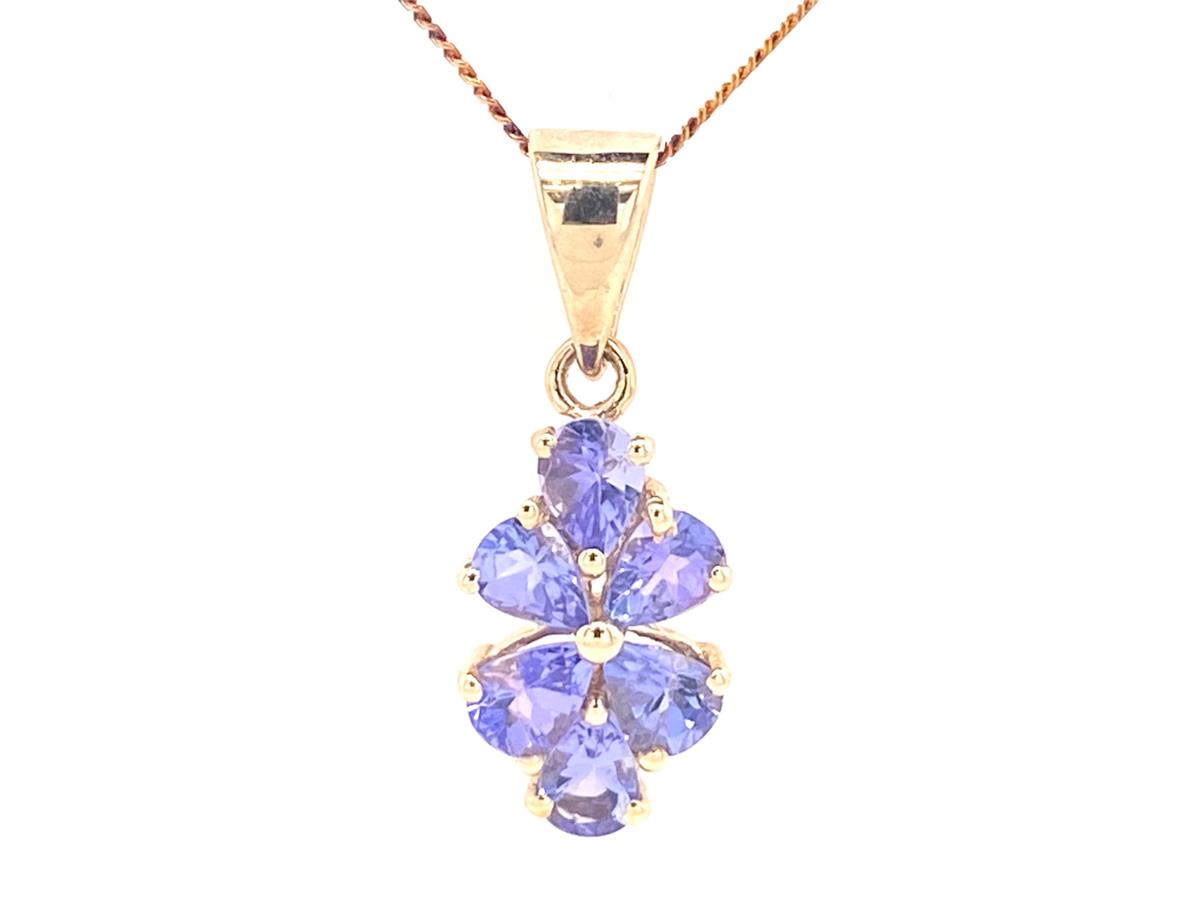 A pretty gem always in demand! This abstract design 10ct. Gold pendant features 6 ear shaped Tanzanites in neat claw settings with a plain loop at the top and suspended from a 9ct. Gold milled curb link chain. In as new condition and gauranteed to be a quick seller!
