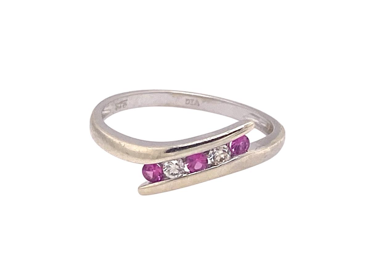A very attractive little 9ct. Hallmarked white gold sparkler - 3 lovely colour Rubies and 2 brilliant cut Diamonds in a neat crossover mount with invisible channel settings - Very neat and uncluttered effect !